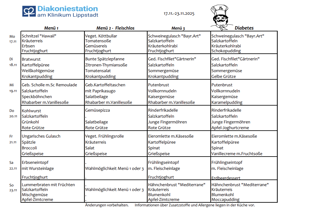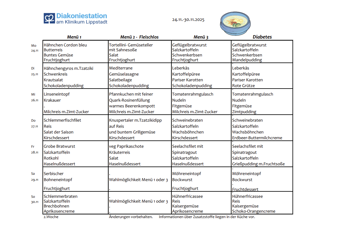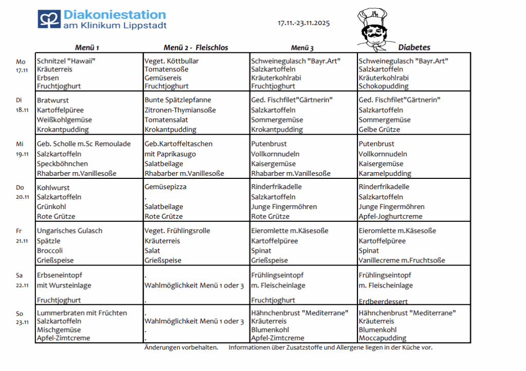Auf dieser Seite halten wir Sie auf dem Laufenden. Im wöchentlich aktualisierten Menüplan finden Sie alle Speisen, die unser Menüservice täglich frisch zu Ihnen nach Hause bringt – abwechslungsreich, ausgewogen und lecker.